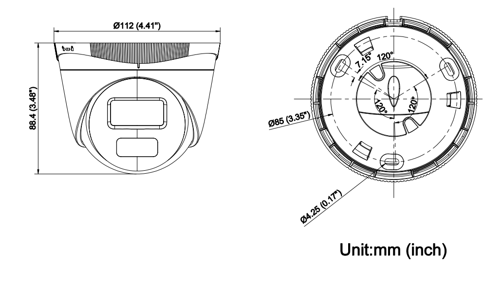 General Function Heartbeat,anti-banding,mirror,password protection,password reset via email Storage Conditions -30 °C to 45 °C (-22 °F to 113 °F). Humidity 95% or less (non-condensing) Power Supply DC12V&PoE Startup and Operating Conditions -30 °C to 45 °C (-22 °F to 113 °F). Humidity 95% or less (non-condensing) Dimension Ø112 mm × 88.4 mm (Ø4.4" × 3.5") Approval